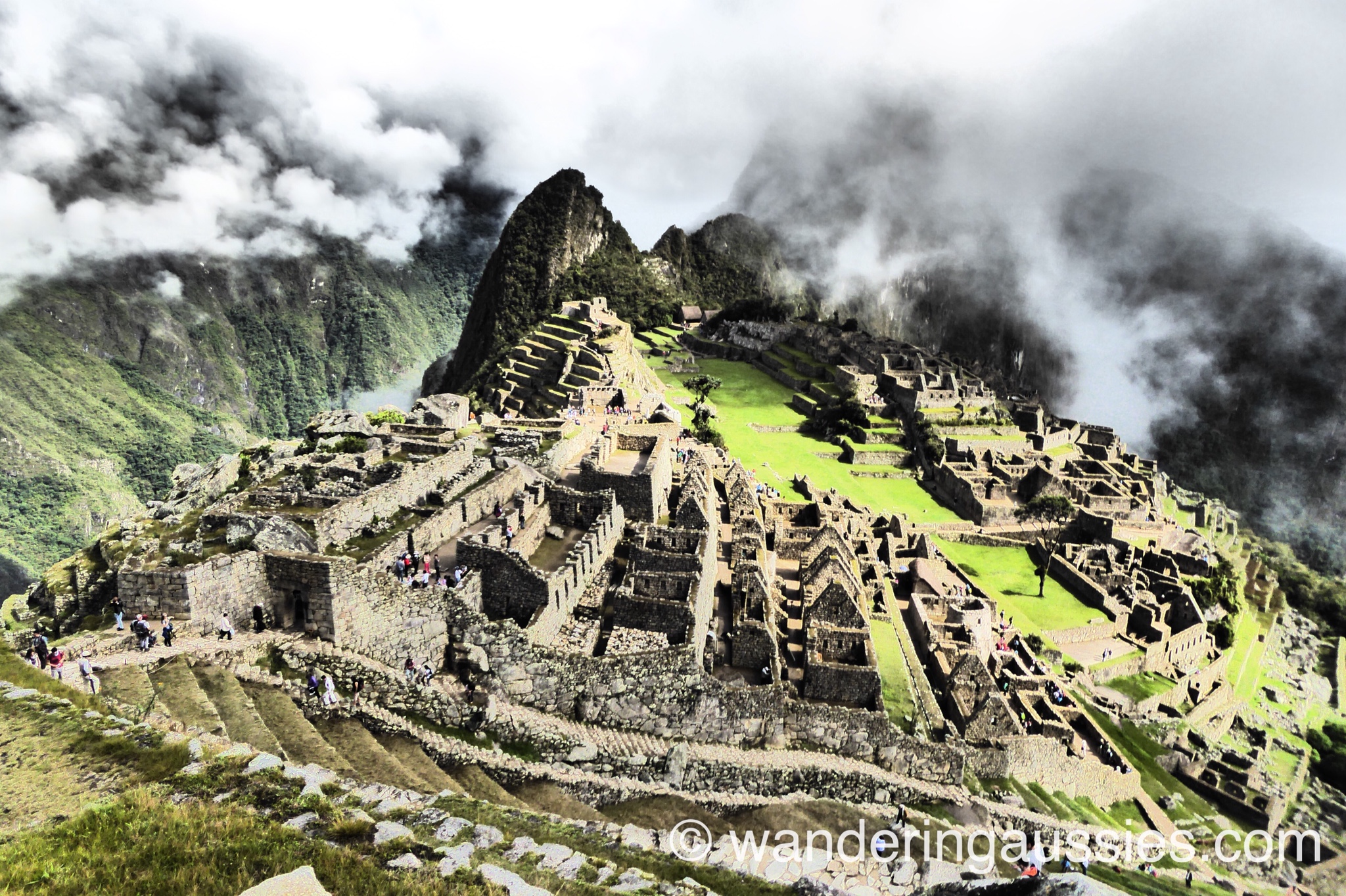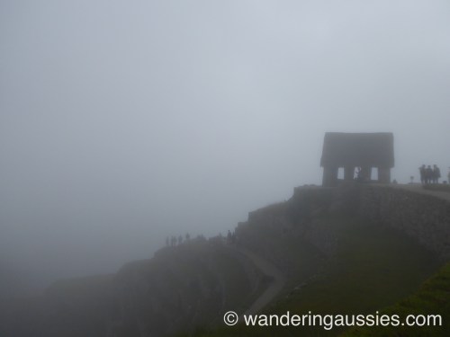 Fortunately most of my knee pain occurs on the descent with stairs so my beloved and I powered to the top to the Guards hut where the best photos were expected to be had. There is a taller mountain opposite the hut you can climb if you buy tickets months in advance – the guards hut was fine for us. As anyone who has been here knows, cloud cover is a common problem so there we stood chatting with a nice young english couple who had the same idea of getting photos from the guards hut. And we chatted, and we chatted, and we chatted – we had one or two brief cloud breaks for a photo or two and eventually they had to leave for their tour after which they said they conceded they may as well hear about the place if they cant see it! Well we continued to wait and about 8:30 two minutes of sun – just when the security guard told me the sun would shine! We turned and thanked him profusely muchos gracias muchos gracias and he laughed and laughed.