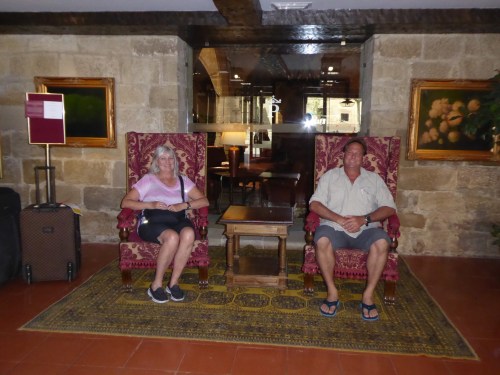 We arrived in chicken town and husband found a German pilgrim passport on the ground. We checked into the hotel opposite the albergue and he went out to hand it over in the hope the owner might still be around and able to see it stuck in the office window of the albergue. Father Devon (who we had seen a few times) was there and so was Dave the Englishman with the nasty red ankles who we had met a few days before.