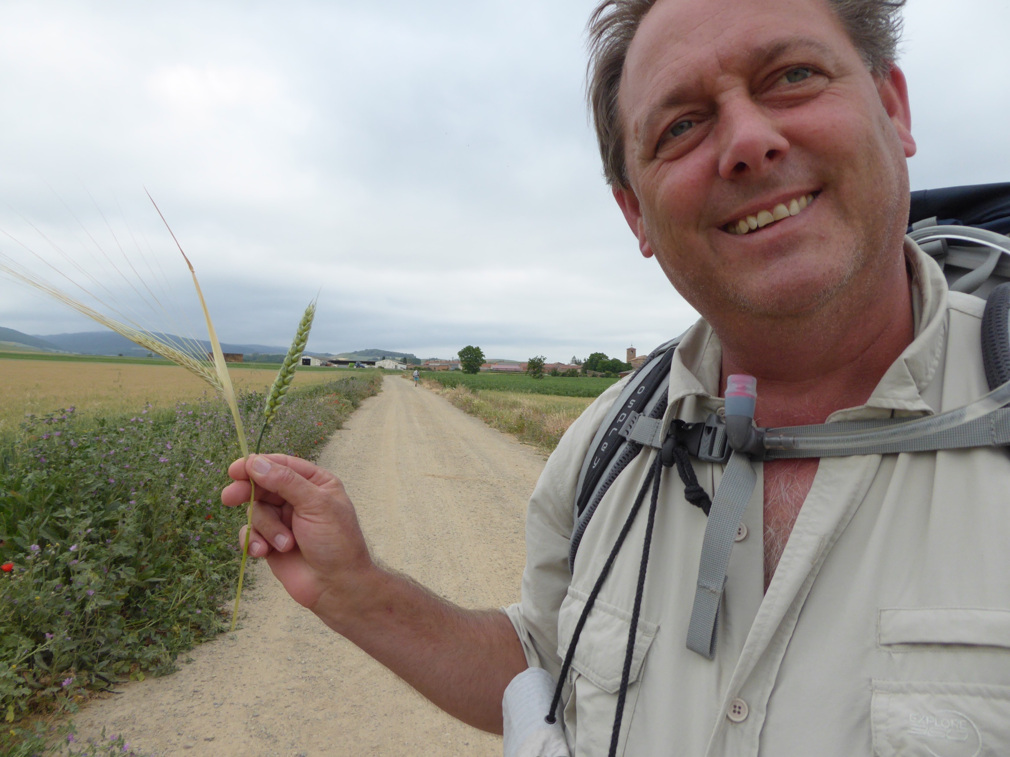 On the outskirts of town we stopped and I zipped the legs back on my pants – they’d been in my pack for a few days now as we had been super hot. I also put my rain jacket on as the clouds were quite dark and I’d sent my other hiking jacket on to Santiago in my pack declutter. We climbed our first hill and husband sat in deep contemplation.