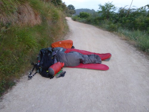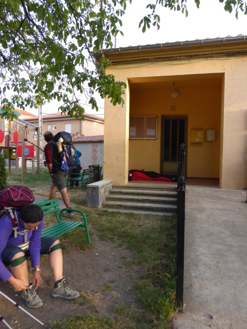 Anyway we kept going another couple of k’s and I stopped to investigate my “twisted ankle” to discover swelling down my lower leg and put on the compression stocking I had bought for flying but had used out of Pamplona as well (the joy that comes with having knee surgery and age) and there was another body in a sleeping bag – this time it was Jacob from Bilbao also partying on at the Albergue – he had the right idea – he was on the verandah of the mayors office!