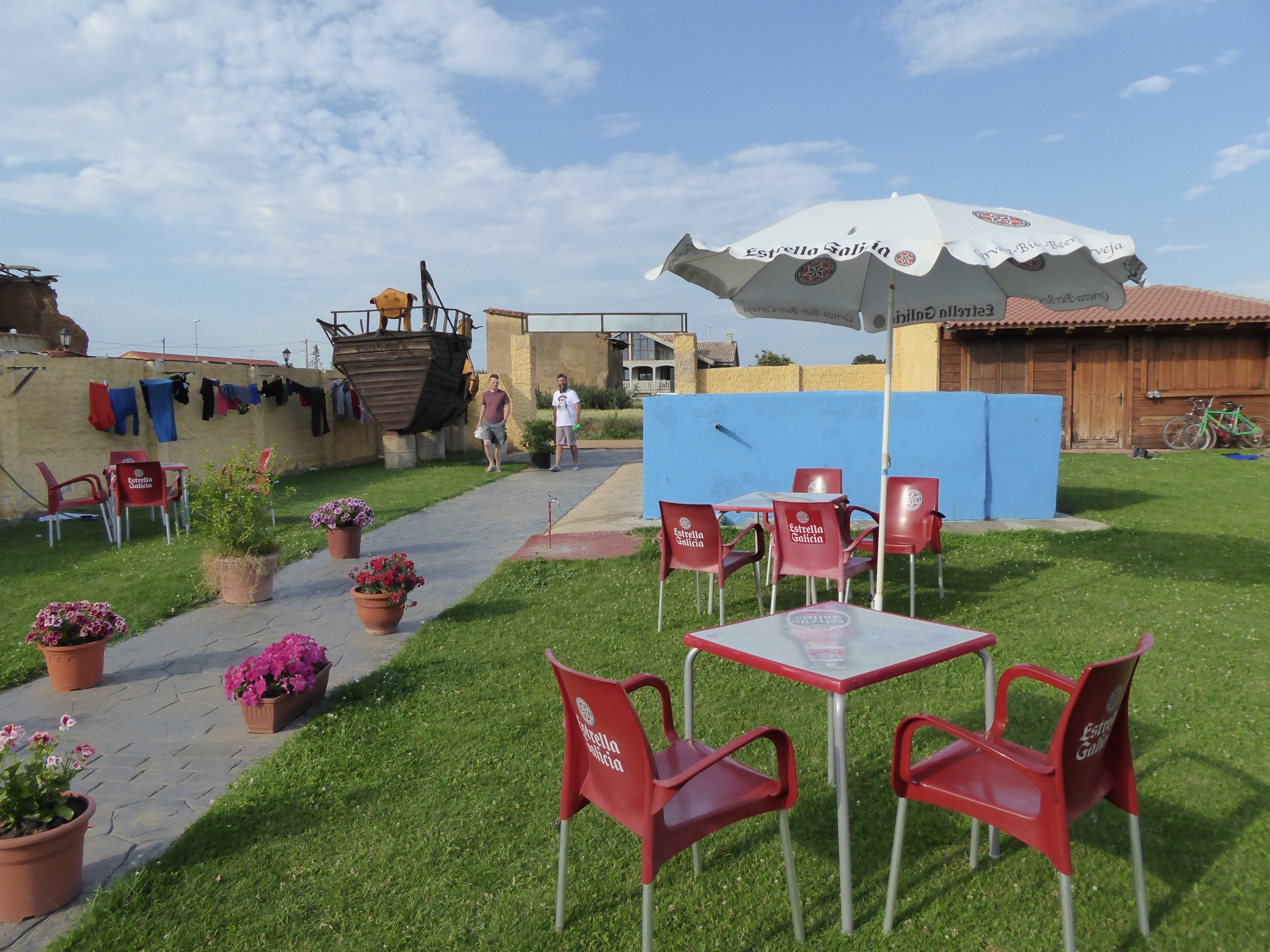Anyway we finally arrived at Jesus’s Refugio and were simply blown away. As you first enter town there is a well maintained little Albergue Padua on your right, with a green lawn and some very relaxed people out the front (I wondered if Janice might have been there weeks before). We had to turn left down a dirt track and could only see what was a dilapidated building next to an old fence with a Pirate ship peaking out. We both wondered whether we (I) had made the wrong decision sending our bags to Jesus and not Padua. As we entered the garden there was an above ground concrete pool (with water) on our left, the pirate ship on our right and a path bordered with flowers leading to the beer garden and our own green lawn – all in front of a not very appealling two storey construction. Inside we checked in and Nerea showed us to our room through what seemed a labyrinth of halls with messages from past pilgrims all over them. Our bags were in our room which seemed to be clean but old and we were thrilled with our 5 euro a night habitacion doble.