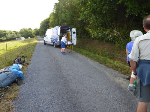 It was John. He was in a dreadful mess. A young american girl was calling an ambulance, the Spanish man we had been seeing with his wife, took over the phone. The young American girl’s brother was trying to dress Johns head. A Canadian lady we had also been meeting was trying to keep John talking. I fumbled in my bag for the last gauze pack I had. John directed them to his first aid kit in his pack. Husband wheeled the bike off the road. Others stood around in shock and in solidarity. I tried to use my phone apps to give a location for the Spanish man talking to the ambulance. Everyone wanted to help. There was not much we could do but wait. Husband offered to take photos with Johns camera so John would know what happened. John reached into his pocket and gave him his camera. None of us would leave until he was in good hands. He had hit the ground with his head. His limbs were covered in blood too. He was conscious and talking. No doubt in shock. There was a fairly large pot hole a little way before. He had probably hit it first. He said his brakes had failed. He had no helmet on. He had a heavy pack on his back. It was amazing he was conscious. He kept talking. The Canadian lady kept asking him questions like where do you live, why did you come here, when did you start etc etc