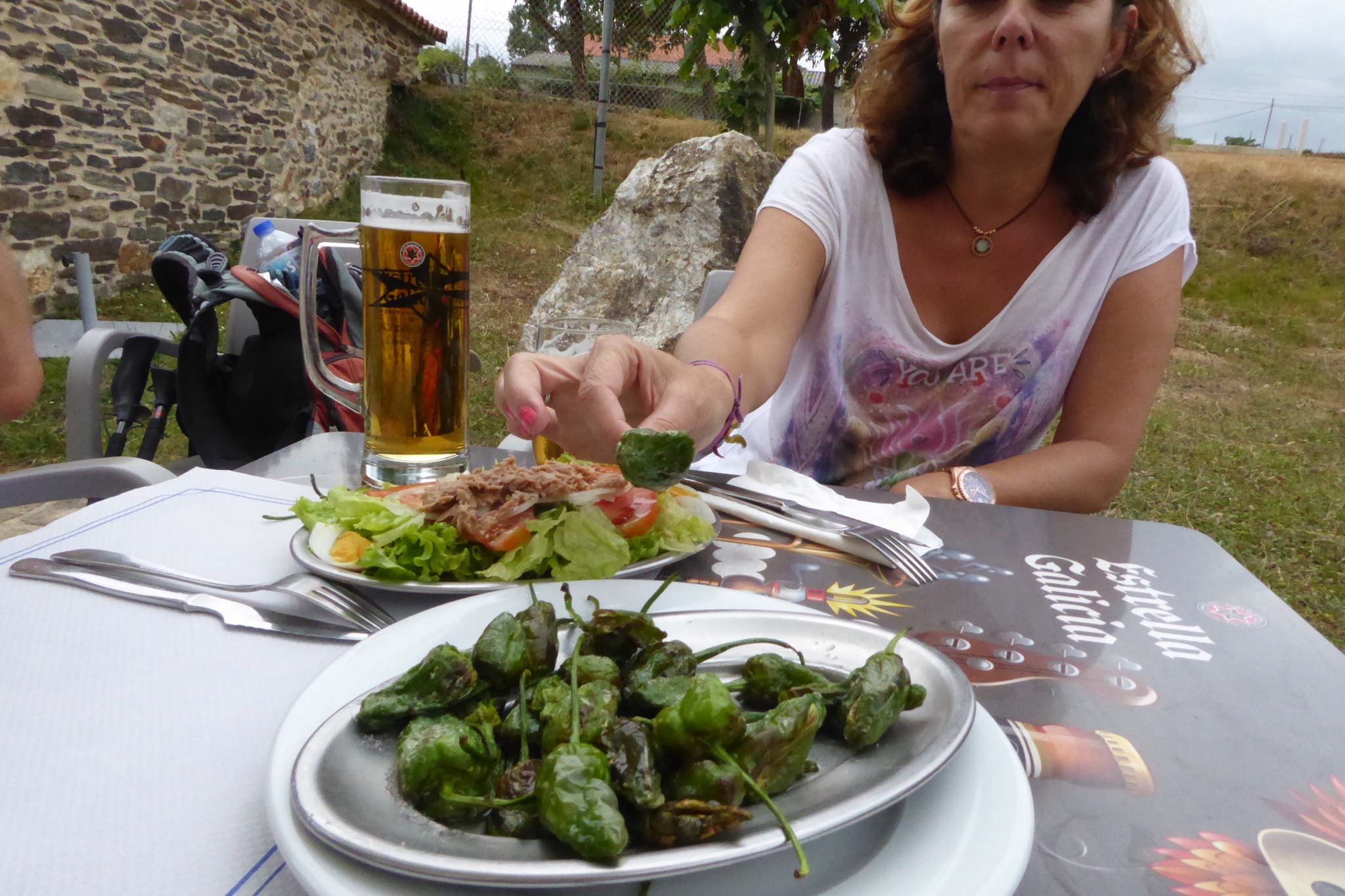Anyway about two k’s before our town they were getting picked up and taken to a casa rural somewhere so we stopped and had a drink with them while they had their lunch. They ordered pimientos del pablas (I’ll have to check that) and said it was like one in twenty. They looked like fried jalapenos but tasted like fried capsicum. They explained that one in twenty means one in twenty will be spicey hot. It was like playing Russian Roulette with capsicum so we all indulged. First Lola got one, her eyes watered, she turned to the side and drank rather large gulps of beer. Then Jorge had one and started coughing and choking. My beloved, who looooves spicey food was jealous he kept getting the mild ones so we ordered another plate. This time I ate two that brought tears to my eyes and, down to the last capsicum, husband got none! I have christened this game “Spanish Roulette” and I am fairly confident we will be eating a lot of capsicums now we have discovered it.