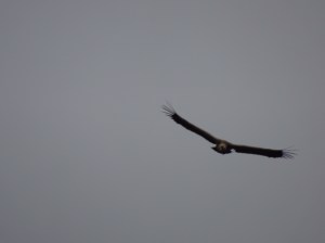 Just off the road a couple of km’s on, and somewhat further up the mountain, was an emergency shelter with some logs outside and we decided this was the ideal place to take a real break and eat our ham and cheese rolls. Michelle pulled out an avocado and we sat warily as the vultures started circling. I had just finished telling Michelle that, according to some stories on the Internet, there was a lady who had fallen in the Pyrenees and the vultures had picked her to the bone before rescue workers could reach her! Needless to say we were not overly impressed with this unnecessary attention! Thankfully they decided we were far too alive to tackle and headed off to find some other more tasty prey!
