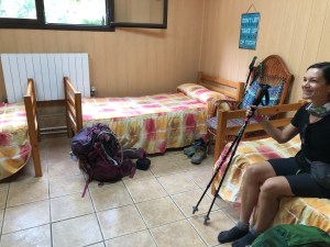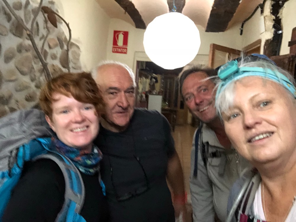 We all caught up for dinner at a nice looking bar that offered the pilgrim menu for 11 euros. Most meals were fine but mine was undercooked fish fillet so I was still a little hungry when I went to sleep. We took some wine back to our room and enjoyed a night cap in the best looking wine glasses we could find whilst we watched the rain tumble down outside!’