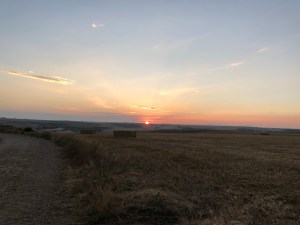 The day started with a hill also for a change! At least it was dark and cool. Eventually we reached the top and the sun started to rise as we were admiring the lights on the wind generators and looking back we saw the sun rise. Apparently we are already on the meseta here but its still very hilly.