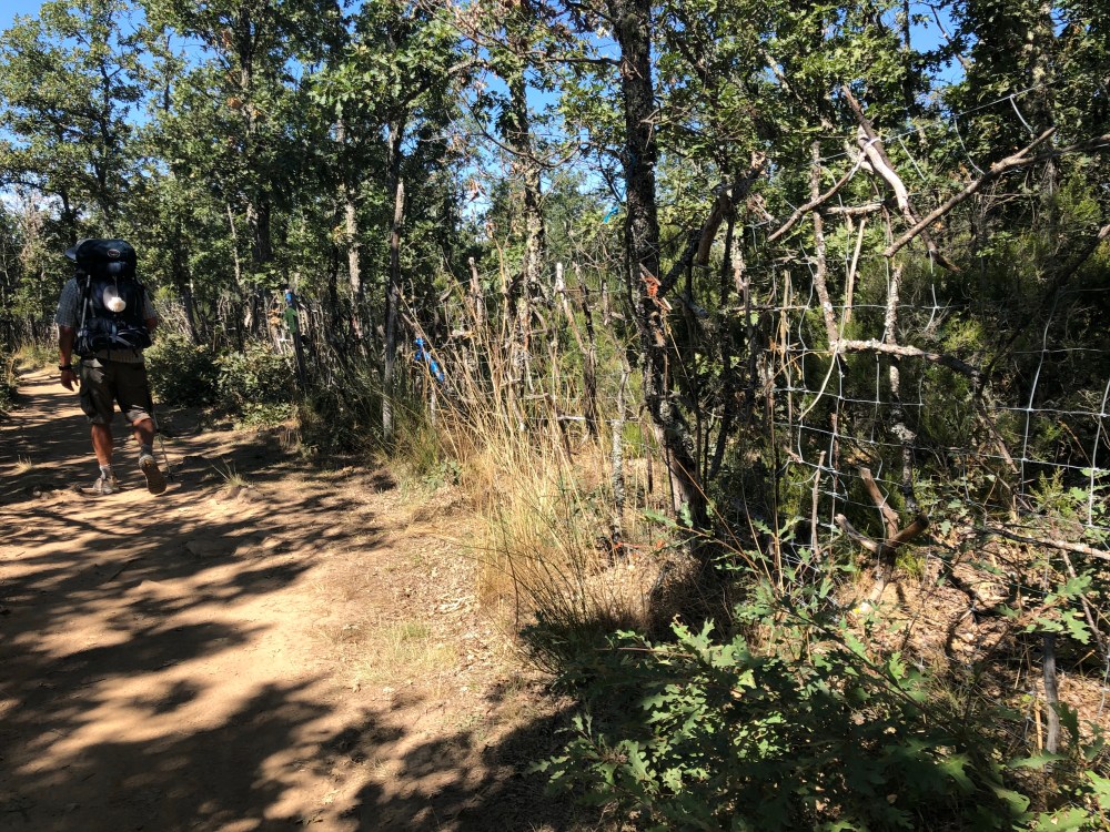Because it was mainly roads and clear paths with a gentle slope uphill it was great for me and I was seen powering along the dirt tracks in a trance at times. Okay I imagine I was powering along. Whether I was seen Or not is irrelevant. I was probably going at a normal pace and was, at least for a few kilometres, not noticeably slow. At least until we hit the sharp rocks a few kilometres out of Rabanal! We skirted around a bit on the road to start with and saw a couple of injured warriors hitch a bit of a lift on a horse and cart! Irish Thomas just may have been involved in this scandal! We saw the rows of timber crosses that we had seen last time and this time I contributed. I made my own cross and left it in the fence.