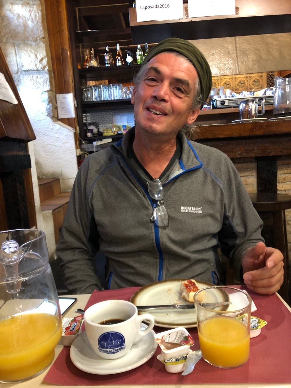I literally bounced downstairs to get my boots on (no I didn’t, I held the hand rail and supported my knees all the way). I was excited to be heading to my hospitalero posting in Nájera but mildly concerned that I wouldn’t make it with a train strike on! Oh well- I headed outside looking forward to a cafe con leche and not really looking forward to bread! It felt a little chilly and I saw the Italian girl from orisson sitting outside with her gigantic pack. I’d marvelled at her stamina when I passed her just out of orisson. I marvelled even more at her ability to sit idly in this cold. I went into La Posada and there he was! The Flemish Yoda! I was thrilled to chat again about the astonishing beauty of the Pyrenees and I drank my cafe con leche and ate my chocolate croissant for E2.70 while he ate his E5 bread coffee and juice.