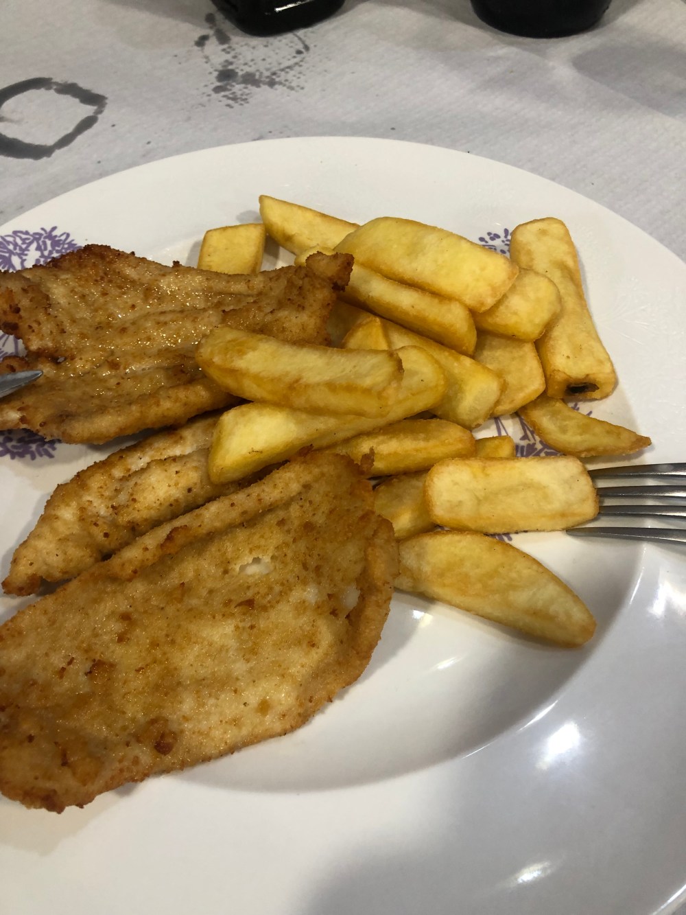 We enjoyed our usual meal – and almost fell over when we were handed the menu with the nice salads! But desafortunatemente it was a mistake! Only ensalada mixta today! Lettuce and tomato a bit of carrot and an olive or two if you dont want onion or tuna on it! Or you can have Russian salad (1 potato peas and mayonnaise). We decided to get one of each and share. We also had chicken and vegetables again!