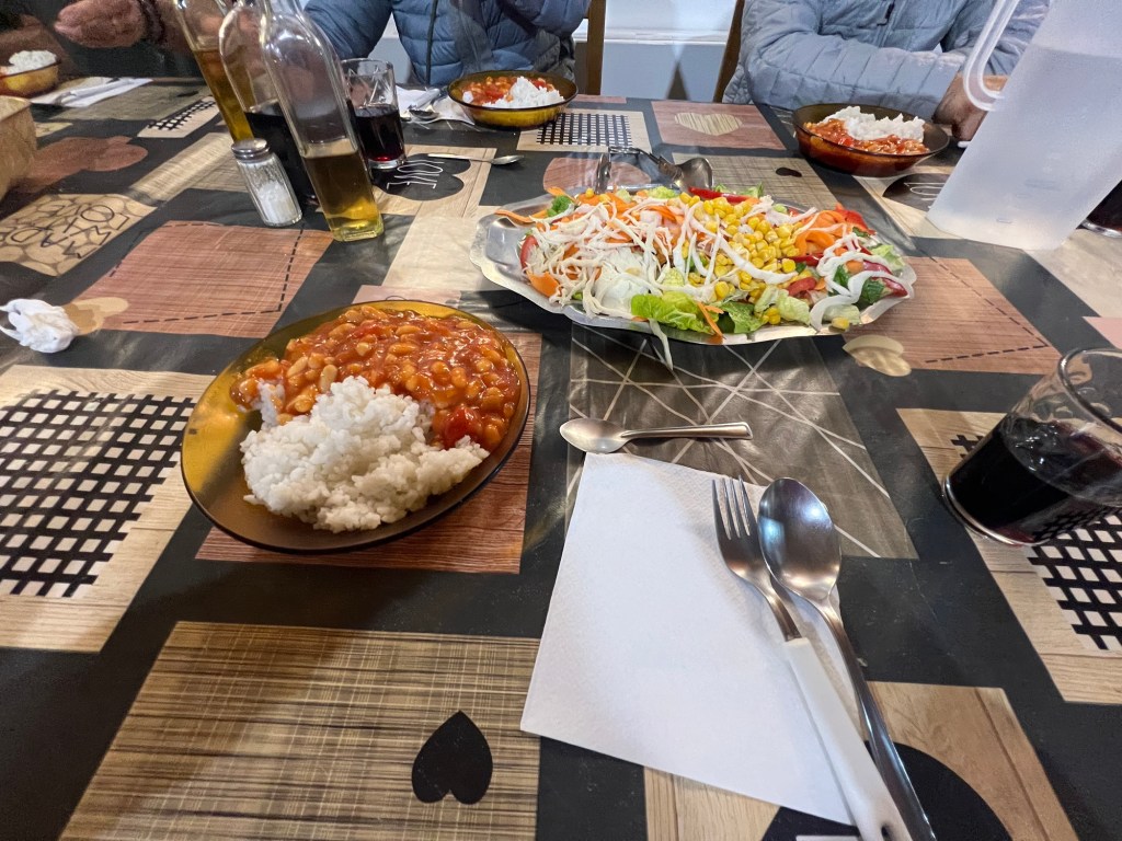 Eventually the volunteers rang a bell and order was restored and the dinner was served. Thank heavens! I was exhausted and wanted to go to sleep. It was almost too late for me to eat. I had thought Italians – pasta and was very hungry. Sadly the guys may well have all been movie stars because they certainly weren’t chefs! Beans and tomato sauce on rice. Luckily there was some salad and bread. The dessert was also not the lovely homemade bread and butter pudding others had experienced at this very establishment. Oh well. We clearly weren’t there for the food!