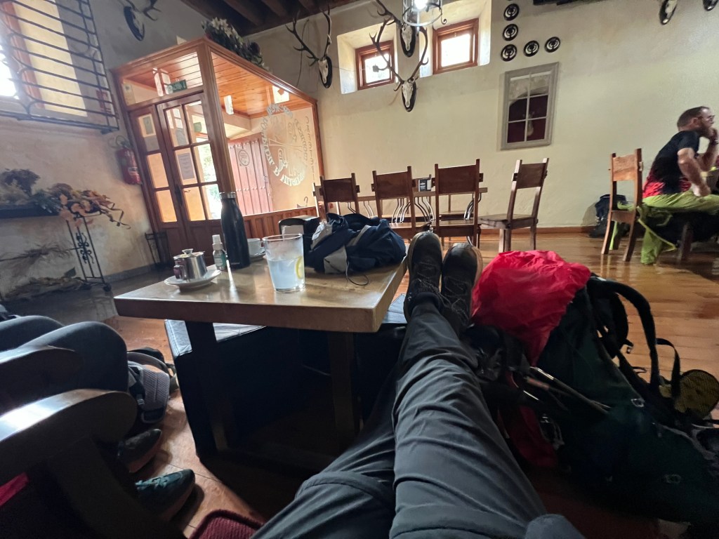 So we arrived at the lovely hotel reception knowing full well we would be escorted to the back and the albergue entrance in due course. The nice lady checked us in and directed us to the bar to wait for her to come back and open the albergue. We saw a pile of luggage and for a moment felt traumatised. Was the bus load of Korean pilgrims heading our way? Thankfully the Jacotrans man came back with another bag and our minds were put at ease. The bar was very cosy and I remembered the decor from before. It was a good place to be as the rain began to fall quite heavily. My friend messaged from the west coast to warn us of a cyclone developing with severe impacts expected for us over the next two days.