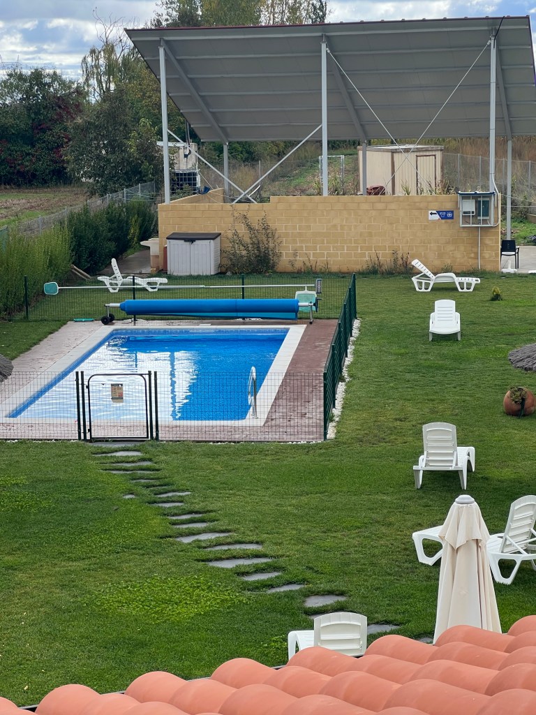 So we stayed on the bus today until San Martin del Camino which I had walked to last time with my beloved and stayed in the Municipal albergue with all the Italians. Yes I do love Italians despite my constantly complaining about them being too loud in the albergues. This time however I took a private room in a new albergue with a swimming pool and the lady from Atlanta had a dormitory all to herself. I did stick my feet in the pool and I would have jumped in and enjoyed it had the following two requirements been met:- 1. I was not sick and 2. The sun was out and therefore a little warmer. The pool missed my presence on both counts!