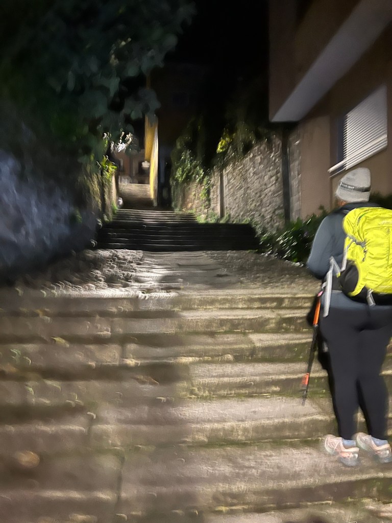 Up up up the stairs and up the hill. We stopped for a quick breakfast and kept going up the hill again. At the top we stopped for a couple of photos before heading down the dark path. We almost made the mistake of following some newbies down the wrong way! A quick reminder to keep our eyes on the arrows especially now.