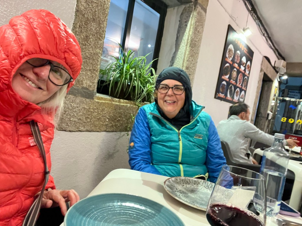 We went down for a meal and were so late we had to sit outside in the cold. We both had puffer jackets with hoods which gave us some comfort. If we hadn’t been so hungry we might have stayed indoors and eaten chocolate!